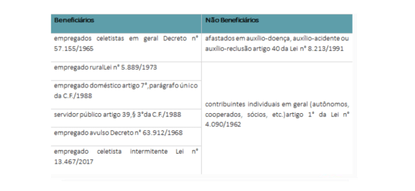 O quadro abaixo traz a distinção entre os beneficiários e não beneficiários pelo pagamento do décimo terceiro salário pelas empresas: